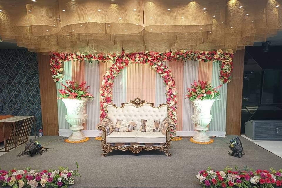 The venue features elegant interiors, centralized air conditioning, modern lighting, and flexible seating arrangements suitable for both intimate gatherings and medium-sized events. Professional in-house catering services provide customizable vegetarian and multi-cuisine menu options to match your event requirements.